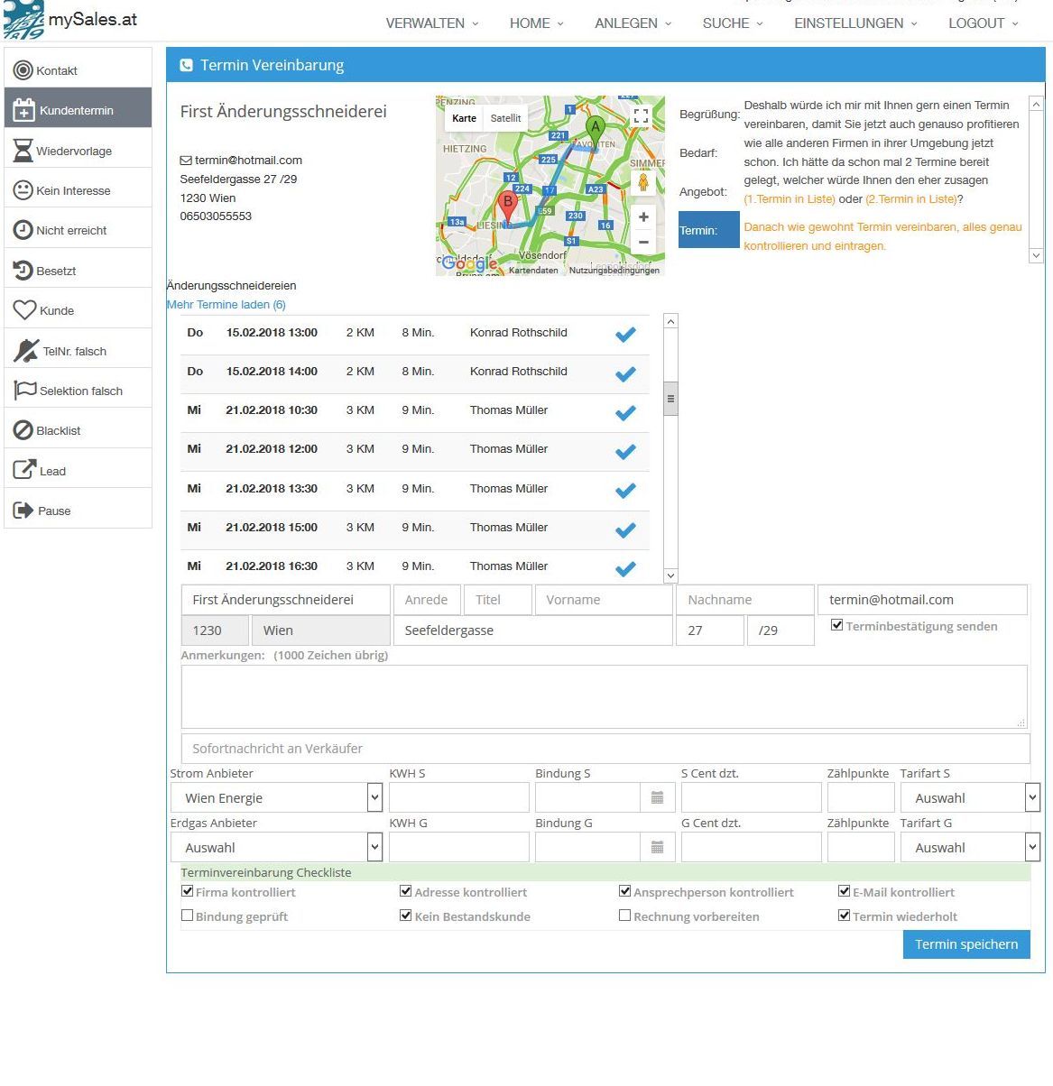 Steuern Sie interne und externe Verkaufsteams und Callcenter. Wir bieten eine gemeinsame Plattform für alle am Vertriebsprozess beteiligten Abteilungen basierend auf unterschiedlichen Zugriffsberechtigungen. Verwalten Sie Ihre Vertriebspartner und deren Vertriebsgebiete. Gewinnen Sie mehr Kunden aus Ihrer Adressbasis. Wir erstellen individuelle Masken für Ihre Auftragseingaben und Schnittstellen zu vorhandenen Systemen. Mit MySales unterstützen Sie Ihre Verkaufsmannschaft und geben ihr ein mächtiges Werkzeug, um mehr Kunden zu gewinnen. Sie erhalten MySales als White Label Lösung mit eigener Domäne und eigenem Logo.